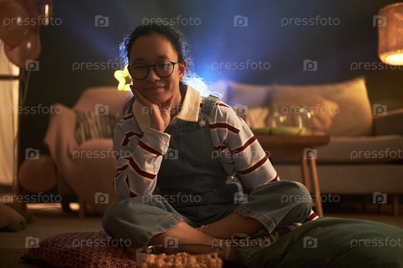 Портрет подростковой азиатской девушки, сидящей с перекрещенными ногами и улыбающейся в помещении