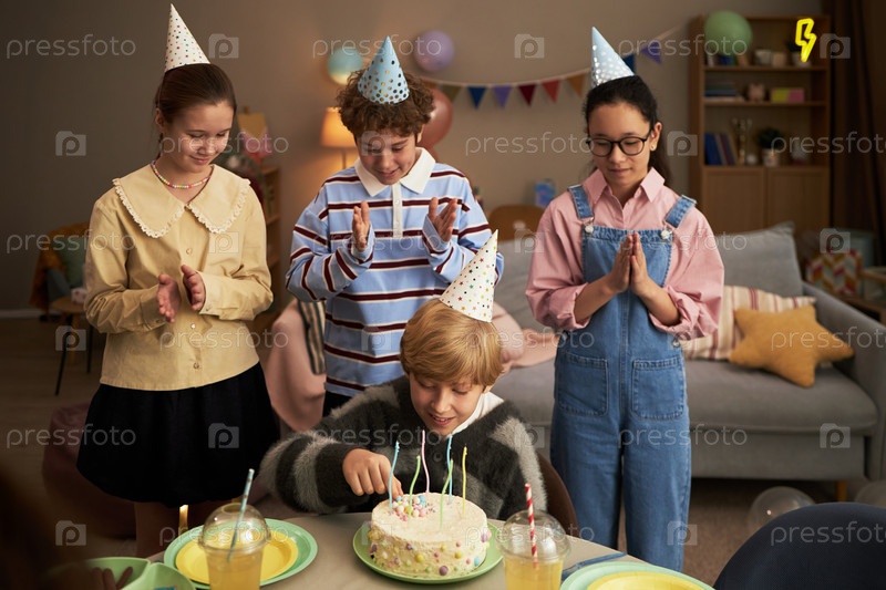 Группа детей празднует день рождения и смотрит, как мальчик режет торт