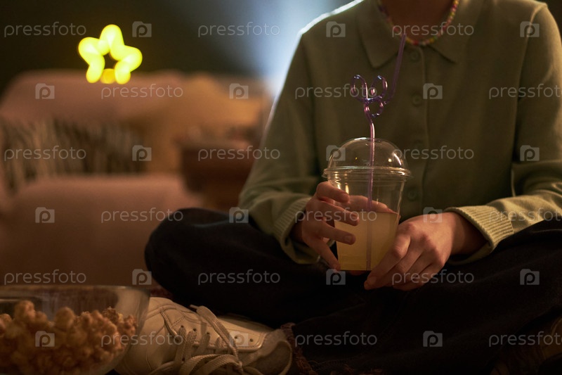 Девушка-подросток сидит с крестовыми ногами, держит сок с декоративной соломой в помещении