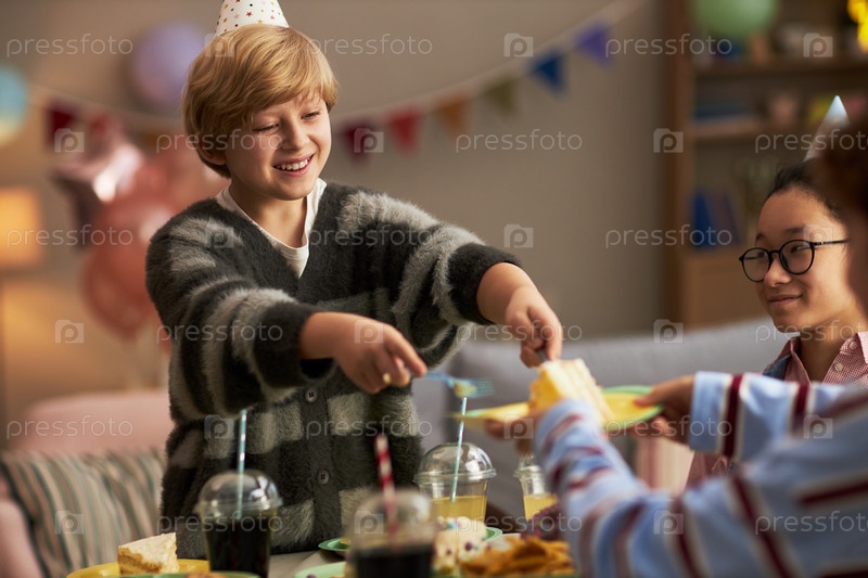 Кавказский ребенок-мальчик улыбается, подавая торт на день рождения на вечеринке