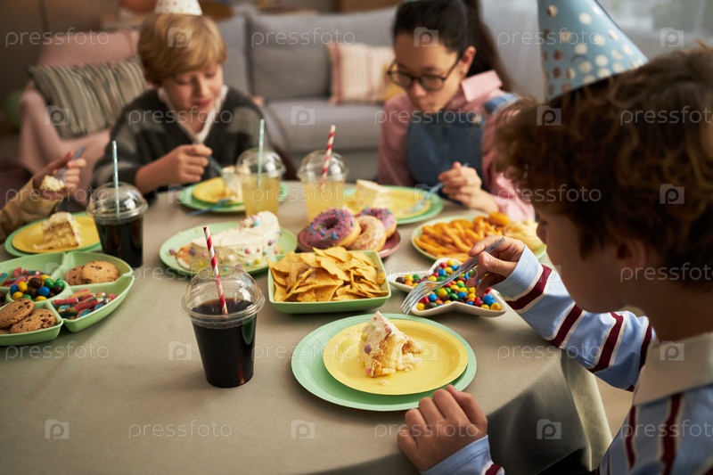 Группа разнообразных детей празднует день рождения и ест сладости вместе