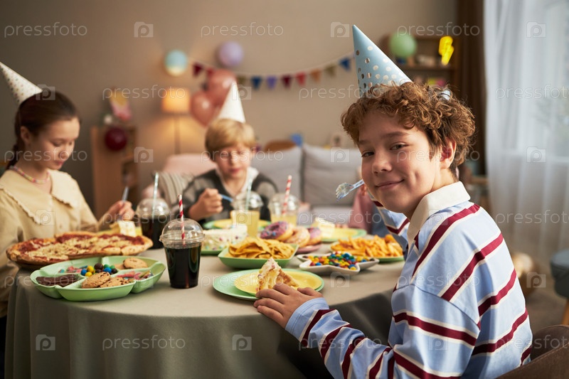 Портрет белого мальчика, празднующего день рождения с друзьями за столом вечеринки