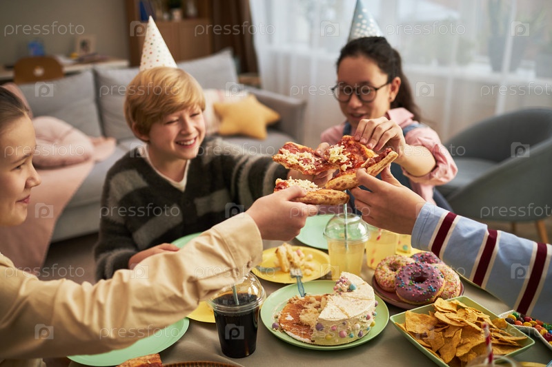 Группа разнообразных детей празднуют день рождения и делятся пиццей в помещении