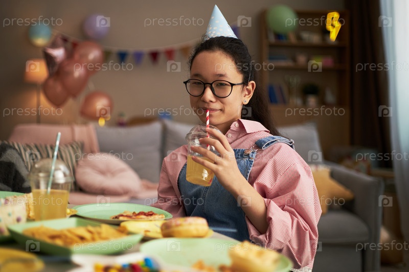 Портрет подростковой азиатской девушки, которая празднует день рождения и пьёт сок