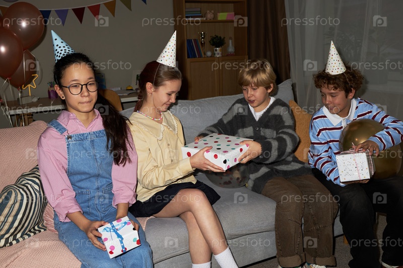 Группа детей в возрасте до девятнадцати лет празднует день рождения и обменивается подарками внутри дома