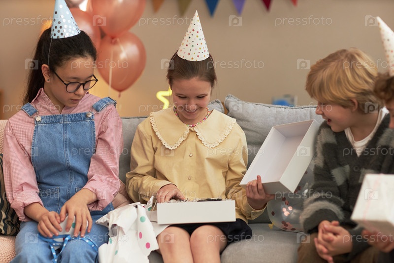 Белая девушка улыбается, открывая коробку для подарков с друзьями во время дня рождения