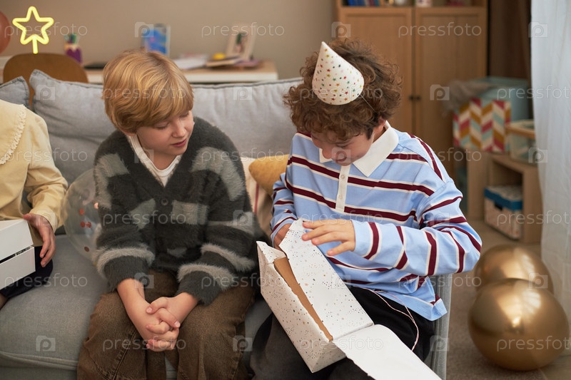 Кавказские мальчики празднуют день рождения и открытие подарок в домашнем собрании