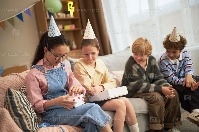 Группа детей, празднующих день рождения и открывающие подарки в помещении