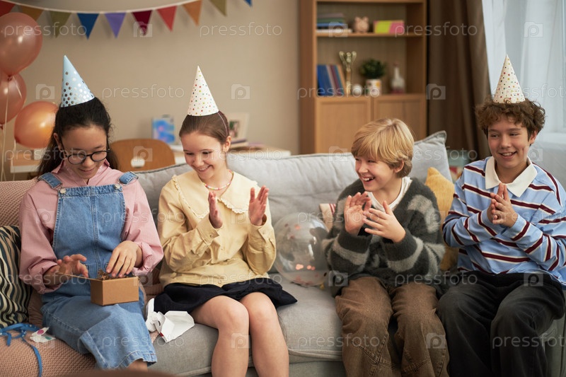 Группа разнообразных детей празднует день рождения и открывает подарочную коробку в помещении