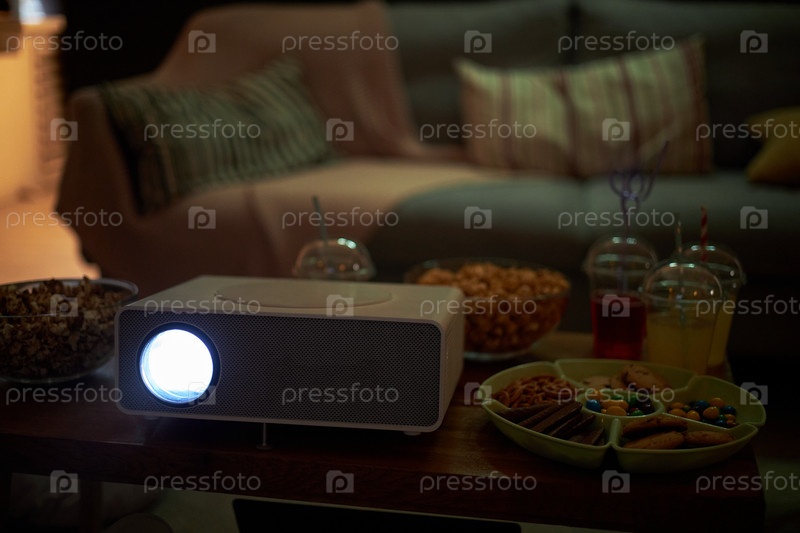Домашний проектор отображает фильм во время ночной закуски в уютной гостиной