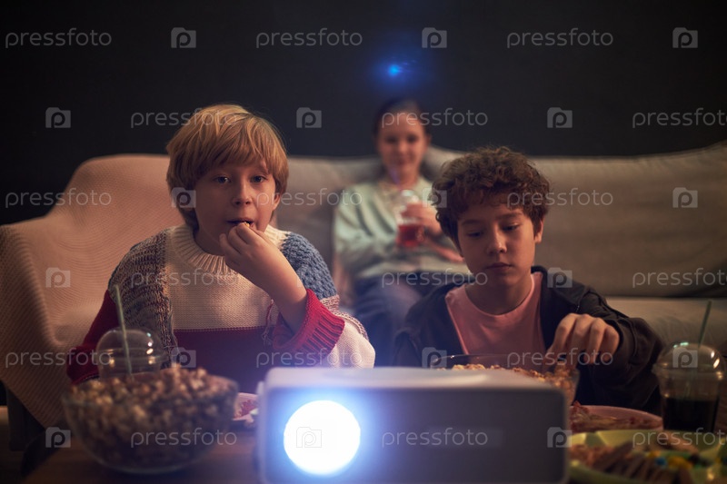 Два мальчика в возрасте до десяти лет едят попкорн смотрят фильм с белой женщиной, расслабляющейся