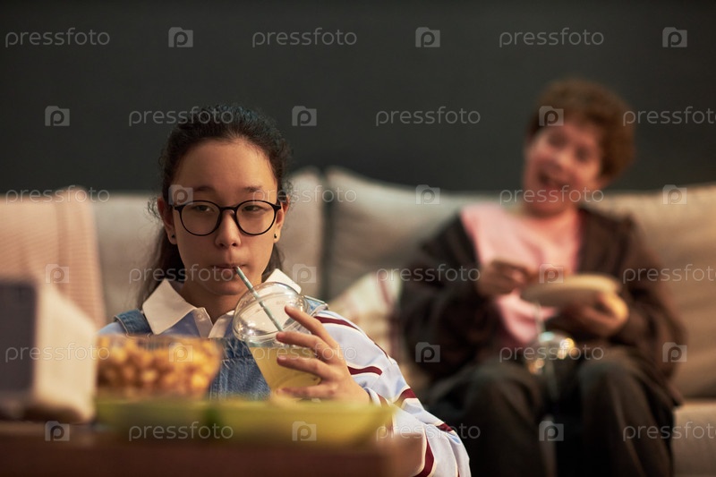Подростковая азиатская девушка пьет сок, сидя с другом и смотря телевизор