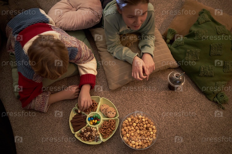 Два белых ребенка лежат на полу, едят закуски и смотрят кино вместе