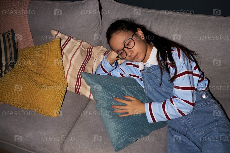 Кавказская девушка-подросток в очках отдыхает головой на подушке, сидя