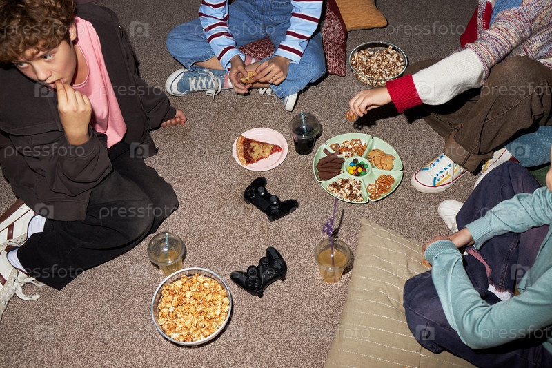 Группа подростков, сидящих на полу, едят закуски во время общественного собрания