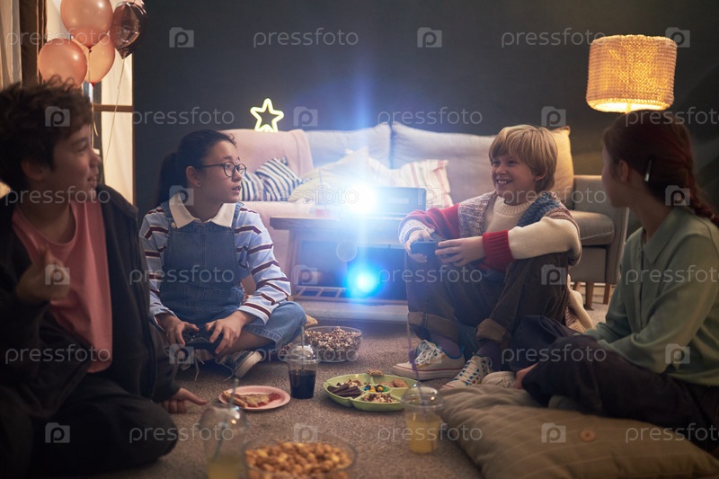 Группа подростков, общающихся в помещении во время уютного сбора вечера кино