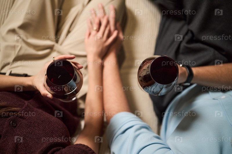 Молодая пара держится за руки и пьет красное вино вместе в помещении