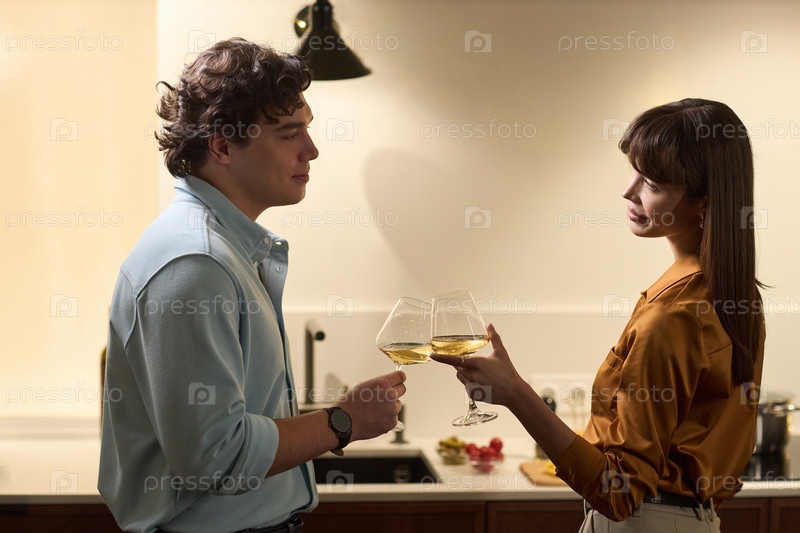 Молодой мужчина и молодая женщина тостируют винные бокалы в помещении