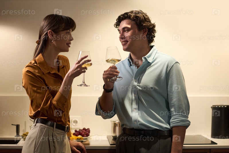 Молодая женщина и молодой мужчина тостят с винными бокалами в помещении