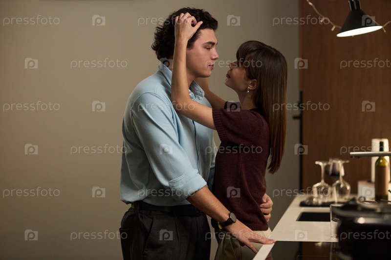 Молодой человек и молодая женщина обнимаются с любовью в помещении