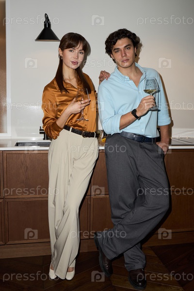 Молодая женщина и молодой человек пьют вино на современной кухне