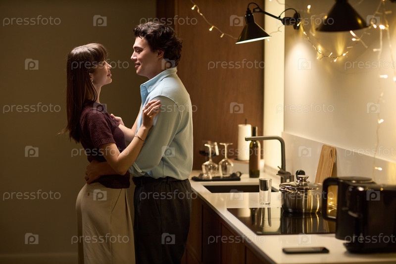 Молодая пара обнимается и улыбается в современной кухне ночью