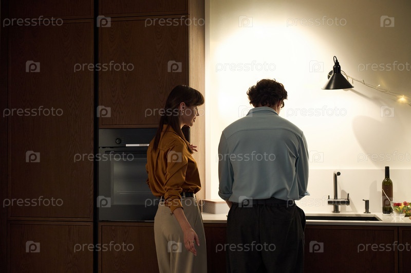 Молодая женщина разговаривает с молодым человеком, который моет посуду на кухне