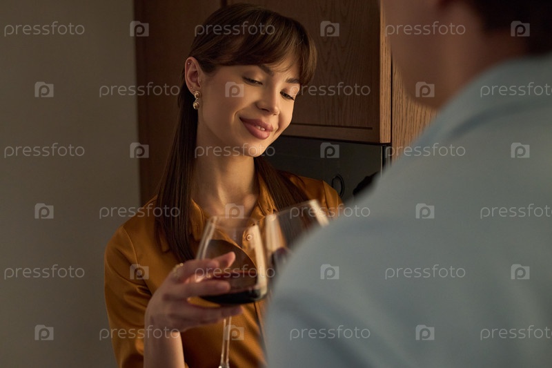Молодая женщина улыбается, пока хлопает по бокалу с молодым человеком
