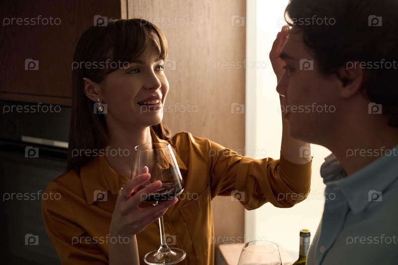 Молодая женщина улыбается, при этом касаясь лица молодого человека и держа вином
