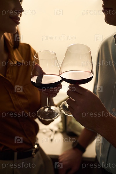 Молодая взрослая женщина и мужчина кланят вместе бокалы с вином