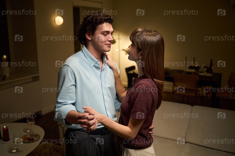 Молодая пара танцует вместе в гостиной во время романтического вечера