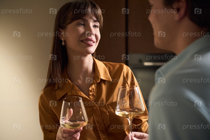 Молодая женщина улыбается, держа винный стакан с молодым мужчиной в помещении