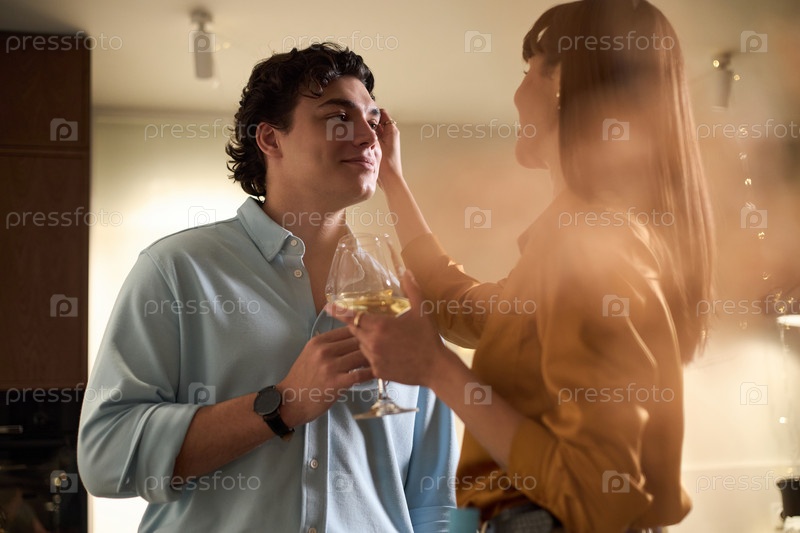 Молодой человек улыбается, в то время как молодая женщина касается его лица