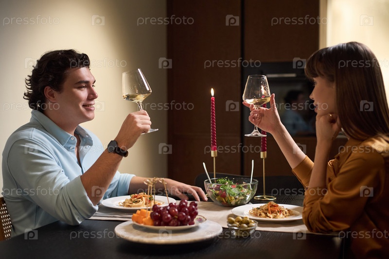 Молодой мужчина и женщина наслаждаются романтическим ужином с вином в помещении