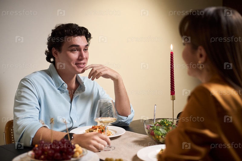 Молодой человек улыбается во время ужина и беседует с женщиной
