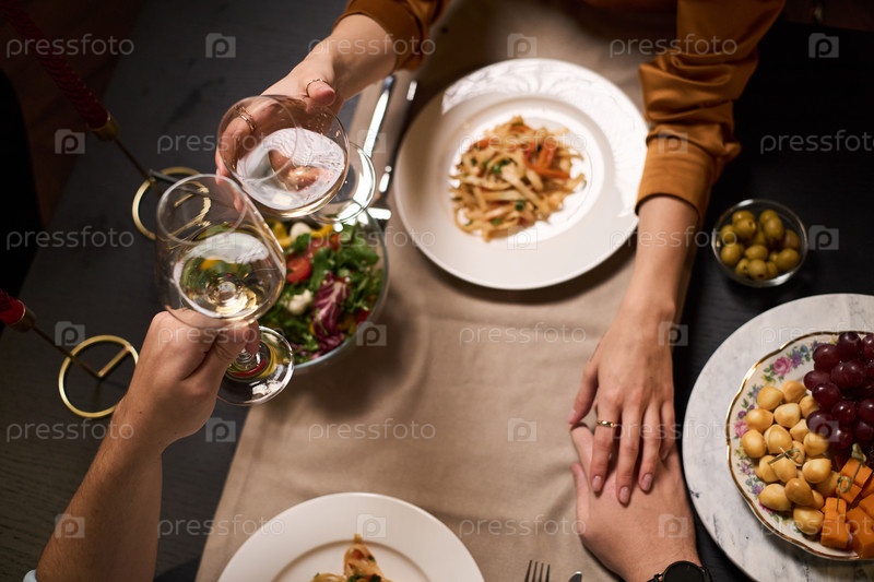 Молодая пара держит друг друга за руки и тостирует вином во время романтического ужина