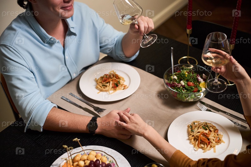 Молодой человек держит руку женщины во время ужина за столом в ресторане
