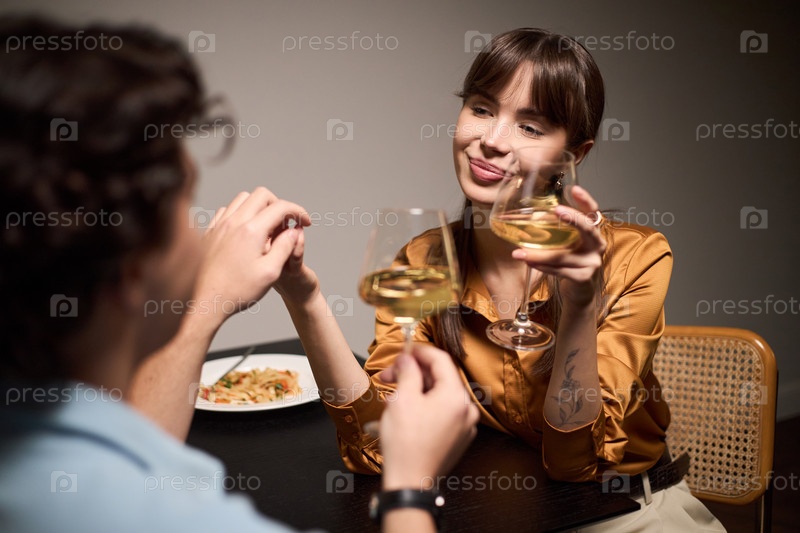 Молодая женщина улыбается, держась за руки и пьет вино