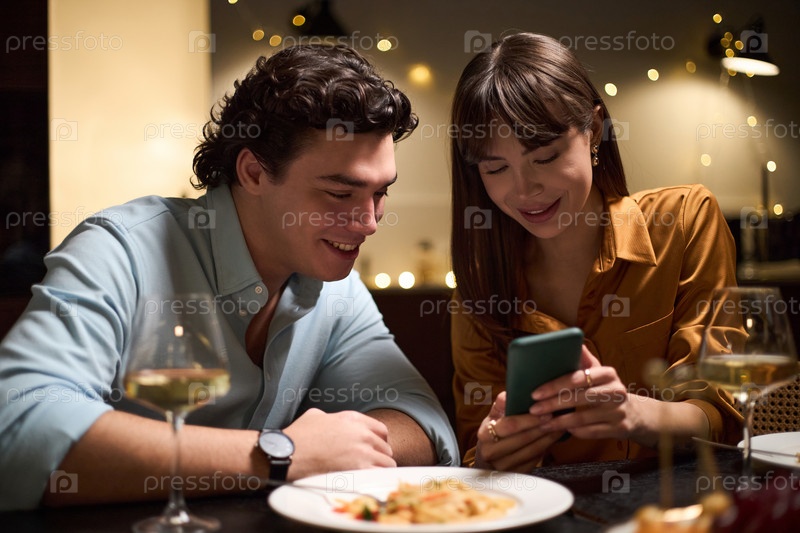 Молодой мужчина и молодая женщина улыбаются, глядя вместе на смартфон