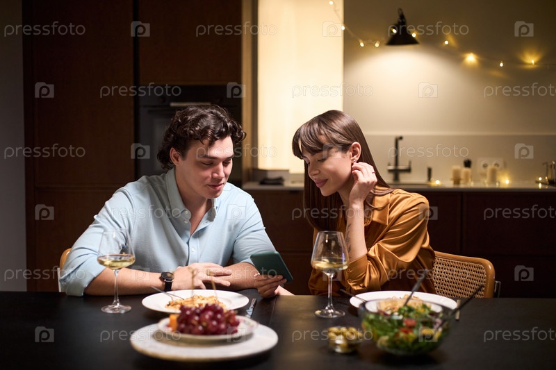 Молодой мужчина и молодая женщина ужинают вместе и пользуются смартфонами