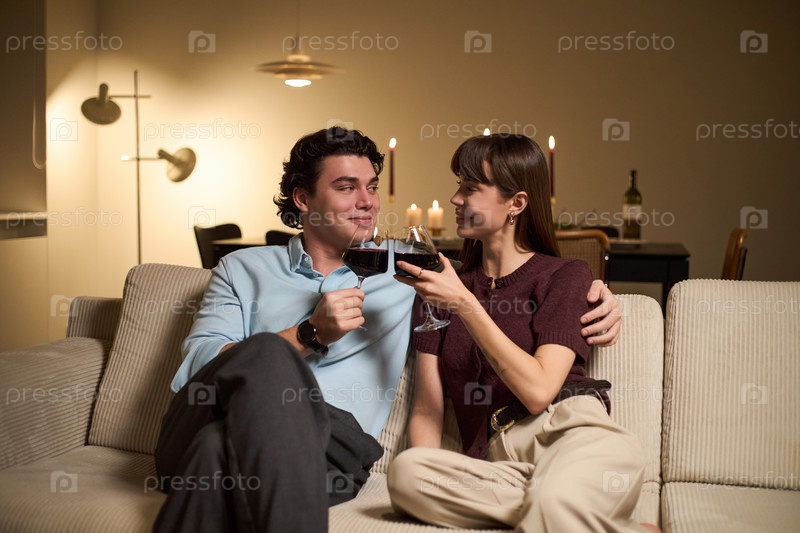 Молодой мужчина и молодая женщина тостируют вино на диване Улыбающийся юноша