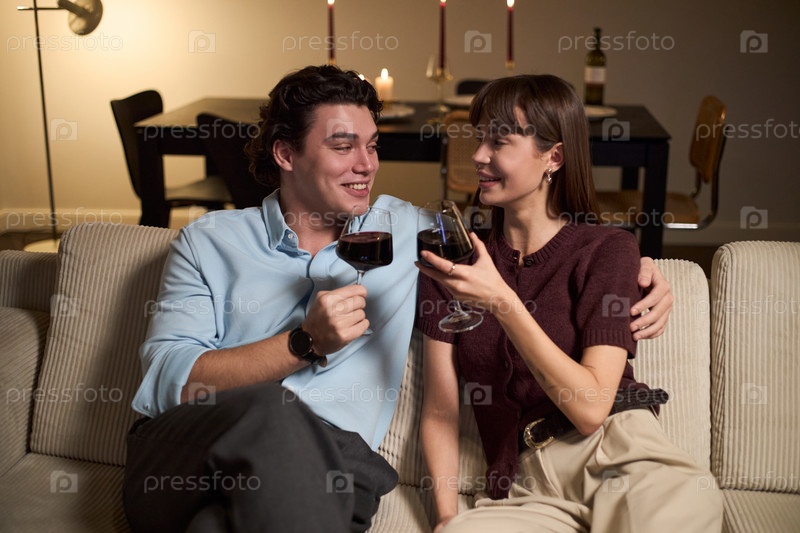 Молодой человек и молодая женщина тостируют за вино и улыбаются