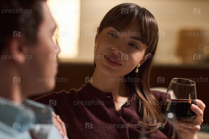 Молодая женщина улыбается, держа винный стакан во время разговора