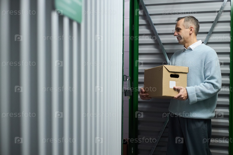 Мужчина средних лет несет картонную коробку внутри хранилища
