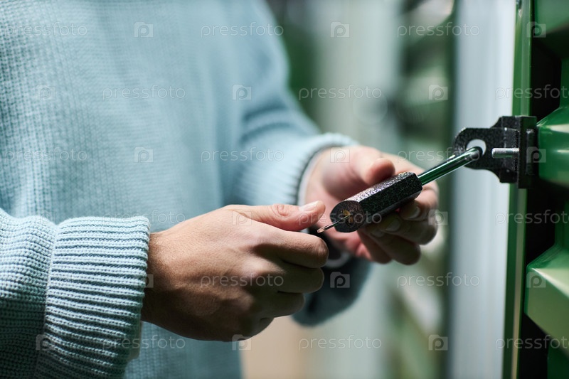 Молодой взрослый мужчина блокирует хранилище двери с замком в помещении