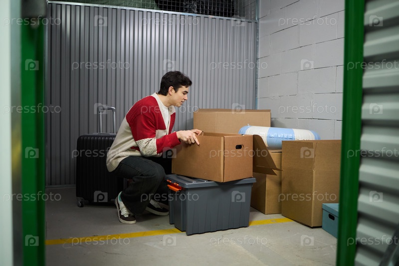 Молодой человек организует картонные коробки внутри хранилища