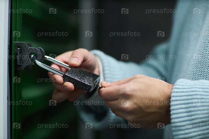 Молодой взрослый мужчина блокирует хранилище с большим замком