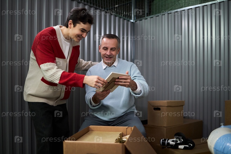Мужчина средних лет улыбается, когда распаковывает коробку с сыном-подростком