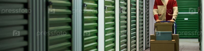 Молодой взрослый мужчина толкает корзину с коробками в самостоятельном хранилище