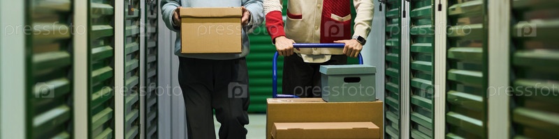 Мужчина среднего возраста и молодой взрослый мужчина перевозили коробки вниз по коридору хранения